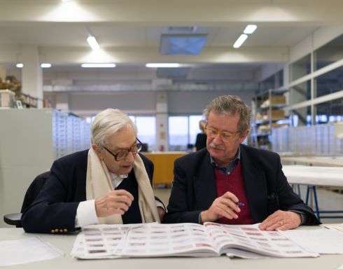 • Ken Adam und Christopher Frayling im Archiv der Deutschen Kinemathek, 2014, Foto: Jürgen Keiper