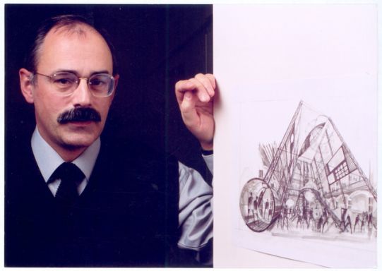 • Gereon Sievernich mit Ken Adam Entwurf für die Ausstellung „Sieben Hügel“, 2000, Foto: privat