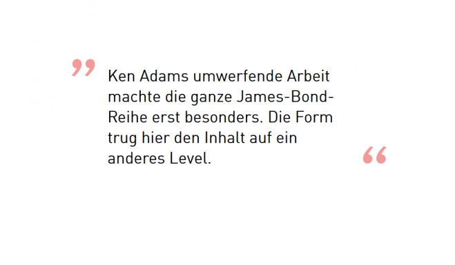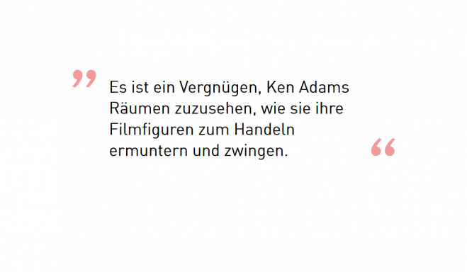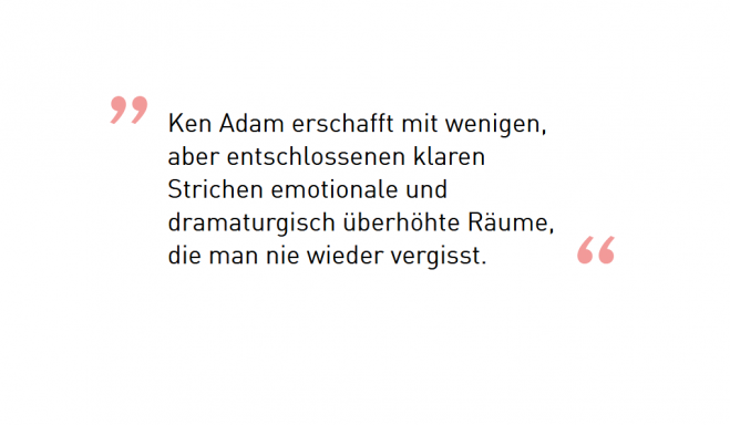 Was macht ihn für uns so besonders? Ken Adams eminente Qualität als Szenograf zeigt sich darin, dass er die Gestaltung des Raums und der Zeit gleichermaßen im Blick hat.“