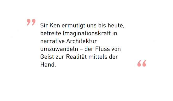 „‚Think big‘, diese Empfehlung von Ken Adam habe ich noch immer im Ohr. Dass für DR. NO eigens ein Vulkan gebaut worden war, wusste ich 1998 nicht. Ken durfte laut Vertrag Los Angeles nicht verlassen. Also ‚musste‘ ich nach Kalifornien fliegen, um über die Gestaltung des Lichthofs für die Millenniumsausstellung (2000) im Martin-Gropius-Bau zu verhandeln. In einem Haus von Richard Neutra in Malibu, direkt am Pazifik, traf ich ihn und Letizia. Ken war mit seinem grandiosen Entwurf bereits fertig, ohne das Haus zu kennen. ‚Vergesst Hannover‘ schrieb damals der Spiegel in Gegenüberstellung der Ausstellung zur EXPO 2000 im selben Jahr."