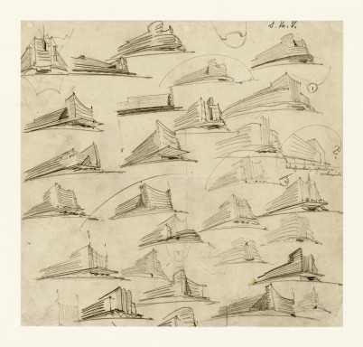 Insbesondere das Werk und die Arbeitsweise des Architekten Erich Mendelsohn sind für das Schaffen Adams von Bedeutung. Parallelen finden sich speziell mit Blick auf die Technik des Zeichnens. Bei Adam handelt es sich dabei um die nach und nach erworbene Fähigkeit, mit vielen kleinen, rasch ausgeführten Zeichenfolgen Bauformen zu entwickeln und durch diese fast filmbildnerische Serialität die ideale Gestalt herauszufiltern. Mendelsohn hatte sich als Soldat während des Ersten Weltkrieges aufgrund von Papierknappheit eine vergleichbare Technik angeeignet, indem er in vielen miniaturartigen Zeichnungen ein Thema bearbeitete und in einem zweiten Schritt die gelungensten Entwürfe in größere Blätter übertrug.9 Einen Eindruck dieser miniaturartigen Zeichnungen gibt sein Entwurf für das Verwaltungsgebäude des Deutschen Metallarbeiter-Verbandes 1929/30.