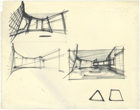 Die Zeichnung unten rechts leitet diese Raummetamorphose ein. Adam zeigt einen aus den Fugen geratenen „War Room“. Die Wände drohen zu kippen. Von einer leicht erhöhten Position aus blickt man in einen vieleckigen Raum, dessen einziger Ruhepunkt der von Stühlen umstellte runde Tisch mit darüber befindlicher Lampe und Lichtkegel ist. Die vormals senkrechten Wanddisplays auf der linken Seite sind schräg in den Raum hineingekippt und stoßen in stumpfen Winkeln aufeinander. Der Raum gewinnt an Dynamik. Verstärkt wird dieser Eindruck noch durch die mit groben Strichen eingezeichnete Kommandobrücke. Fast trotzig, wie eingebrannt wirkt die reduzierte zweite Ebene, so als könne sich Adam noch nicht ganz von dieser Idee lösen. Vergleicht man in diesem Kontext erneut die Werbegrafik von RCA für NORAD, dann zeigt sich einmal mehr eine Parallele zwischen Adams Entwurf der Kommandobrücke als zweiter Ebene und der Werbegrafik. In dieser Skizze hat Adam eine prägnante Figur- oder Raumform mit leichter Hand, spontan und intuitiv entwickelt, ihm genügen zunächst wenige Striche, um den Charakter des Raumes zu umreißen.