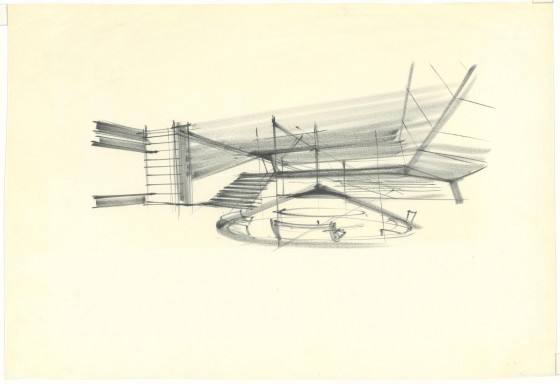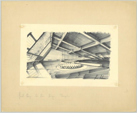 Mit wenigen kraftvollen Linien ist auf weißem Untergrund ein in zwei Ebenen untergliederter Raum skizziert. Auf der unteren Ebene ist eine von der Decke tief herabhängende runde Lampe zu erkennen, deren Strahlen einen großen kegelförmigen Lichtraum bilden, der am Boden eine kreisrunde Fläche definiert. Innerhalb dieses Lichtkegels sind geschwungene Sitzbänke eingezeichnet, die das Rund eines angedeuteten Tisches umstellen. Dieser dreieckige Lichtraum wird in den Folgezeichnungen zum Hauptmotiv und Zentrum seiner Konzeption des „War Rooms“.