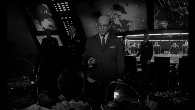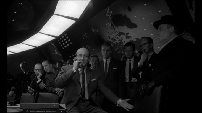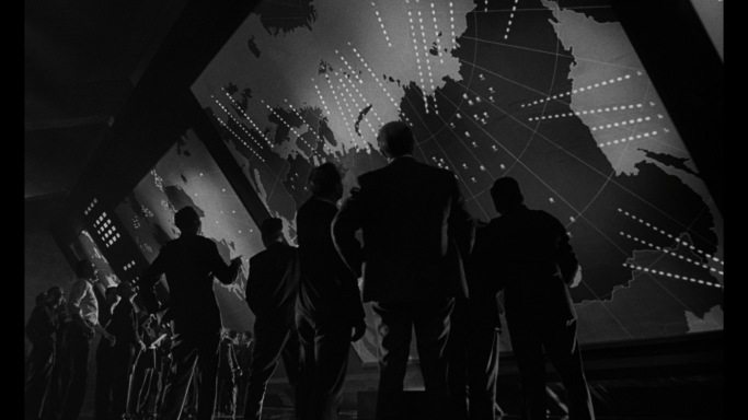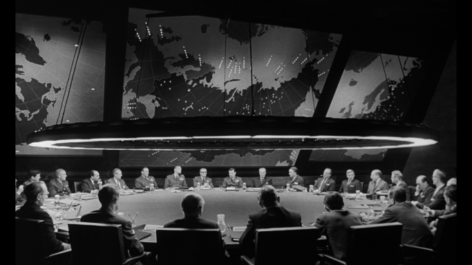 Innerhalb des Films taucht der Set des „War Rooms“ in acht unterschiedlich langen Sequenzen auf. Je nach Inhalt und Bedeutung der Szene werden unterschiedliche Schwerpunkte in der Darstellung des Raumes gesetzt. Gerade durch die einfachen, aber starken Raumelemente Tisch, Lampenring und Kartendisplays sowie die Formen Kreis, Quadrat und Dreieck entsteht ein enges visuelles Verhältnis zwischen dem Zuschauer und der Handlung, die sich innerhalb des „War Rooms“ abspielt.