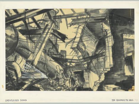 "Eine der Schlüsselszenen des Films spielt in einem ausgebombten Gebäude: Nachdem bereits einer ihrer Kameraden bei der gefährlichen Arbeit ums Leben gekommen ist, wird das Kommando nachts zu einer Ruine gerufen, in der ein Kollege unter einem riesigen Blindgänger eingeklemmt wurde. Zu dieser Sequenz existieren eine Skizze und ein ausgearbeiteter Entwurf im Ken Adam Archiv der Deutschen Kinemathek. Er zeigt in der linken Bildhälfte die schräg im zerborstenen, von Trägerbalken durchzogenen Gebäude steckende Bombe sowie die Rückansicht von Koertner, der zu diesem Zeitpunkt die Bombe bereits entschärft hat und auf medizinische Hilfe wartet. Im Zentrum des Bildes sieht man zwei sich ihm mit einer Taschenlampe nähernde Männer. Der mit breitem Strich gezeichnete Entwurf ist als filmisches Bild fast identisch umgesetzt worden."