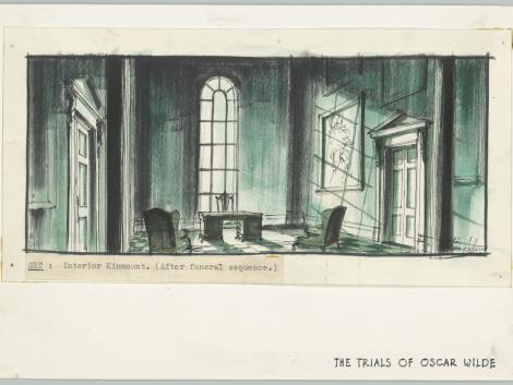 "So what I decided to do was a complete stylisation using all the classical elements of the St James's Theatre and the Café Royal. The only new design element was a very tall, slender French window with a circular top at the end of the set. Then I used Georgian doors from the St James's and I painted the whole floor like Siena marble. I had a very good painter and it was beautifully done. Then I had the idea of treating the set in two colours only – terracotta for the walls, and everything else in black – because it was after the funeral." (Ken Adam)