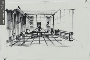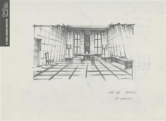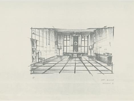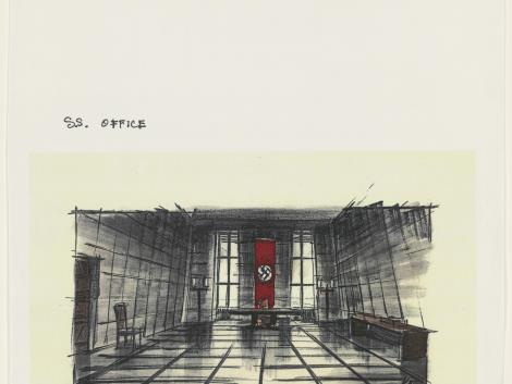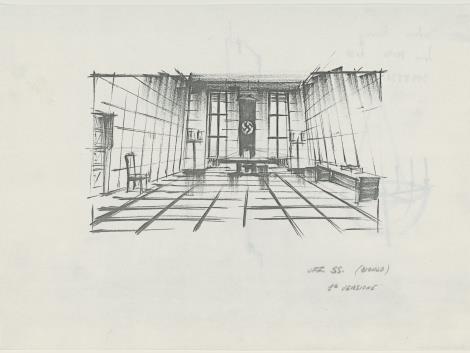 "[Christopher Frayling:] One of the most memorable sets in Salon Kitty is the vast Nazi office, which is so large that the officer roller-skates the length and the breadth of it. It has huge high ceilings, giant windows and swastikas everywhere. It's overpowering.