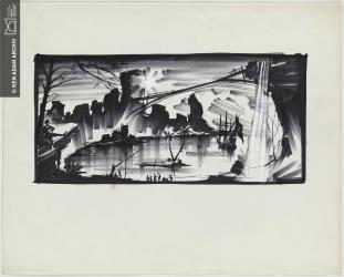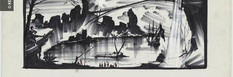 Der Wunderknabe Peter Pan, der fliegen kann und niemals erwachsen wird, nimmt Wendy und ihre Brüder aus London mit auf eine abenteuerliche Reise zur Insel Nimmerland, wo sie gegen den gefürchteten Piraten Captain Hook kämpfen. – Welch fantastischer Film nach der Geschichte von J. M. Barrie dies hätte werden können, zeigen die Skizzen, die Ken Adam im Jahr 1969 für dieses Projekt angefertigt hat: Da ist das Haus der Kinder in London mit Glasfassade und großem Treppenhaus. Da ist die schwungvoll-verspielte Landschaft Nimmerlands und das düster-bedrohliche Piratenschiff in der Lagune der Piraten, eine jener verborgenen Machtzentralen, die von den Helden erobert werden müssen. In Adams teilweise abstrakten Zeichnungen, die deutlich machen, wie er sich dem gewünschten Filmbild näherte, dominieren immer wieder Kreisformen, so etwa bei den Schächten, die hinab ins „Haus der sieben Bäume“ (Seven Trees) führen. Adams Assistent Ivor Beddoes zeichnete die Sequenz vom Flug der Kinder nach Nimmerland.